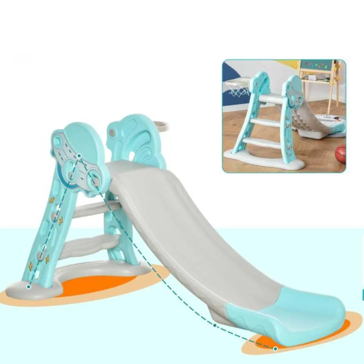 - Función 2 en 1: tobogán infantil y aro de baloncesto.