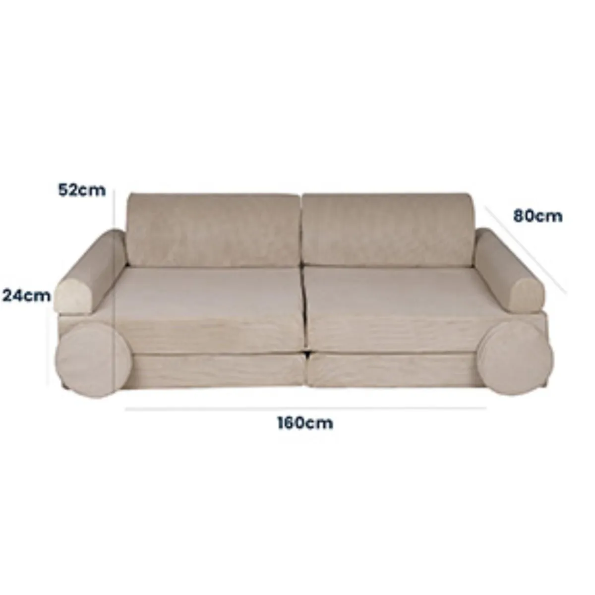 La cubierta de pana suave al tacto es una de las características destacadas de este sofá, garantizando una superficie delicada que asegura la comodidad durante el uso. Además, su fácil limpieza es clave para afrontar las travesuras de los pequeños artistas. Equipado con dos pufs, estos no solo son elementos decorativos, sino también accesorios funcionales que añaden alegría y comodidad al tiempo de juego.