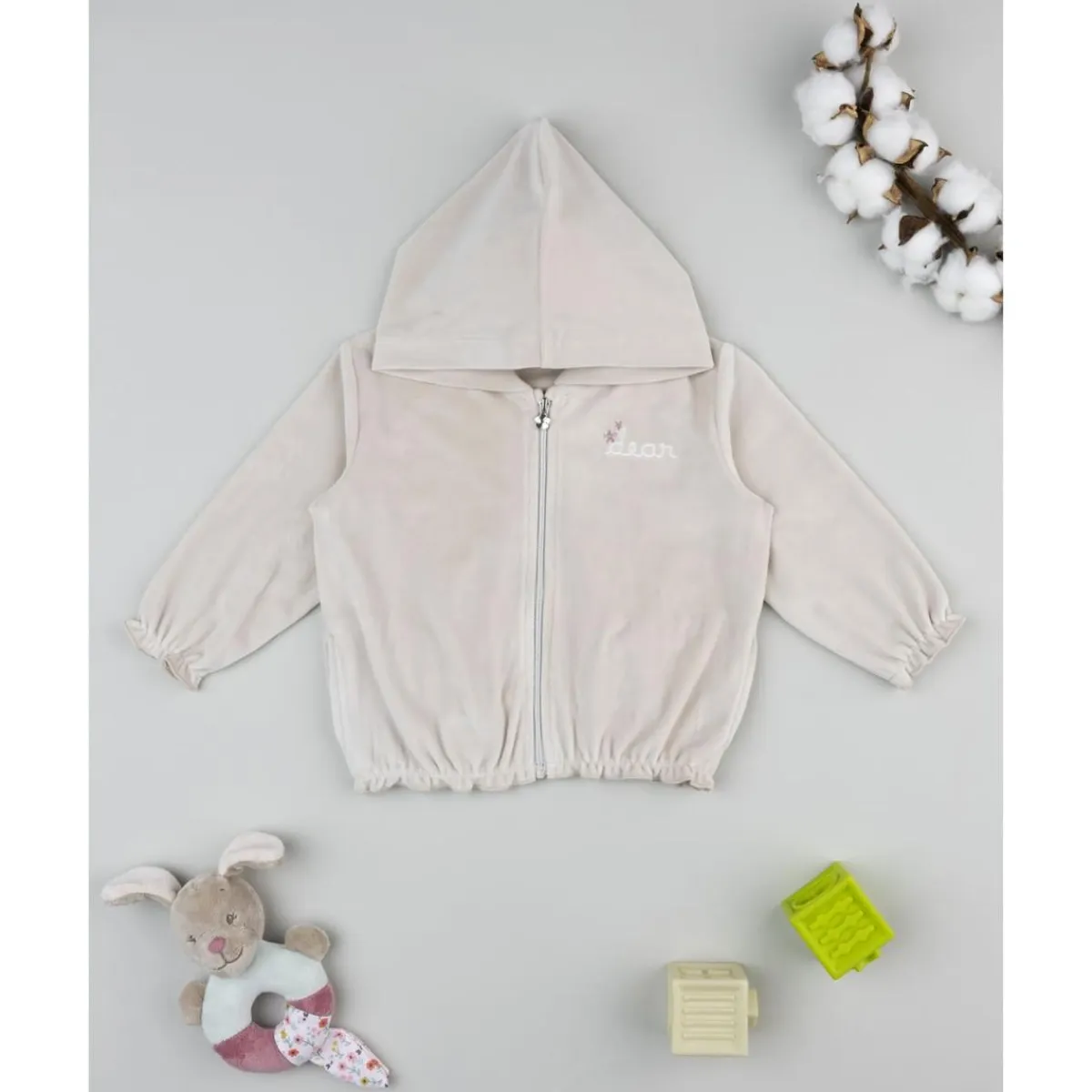 La sudadera en terciopelo beige para niña es una prenda básica y cálida para los meses más fríos. Con capucha, bordado decorativo y cremallera frontal, combina comodidad y estilo en una sola pieza.