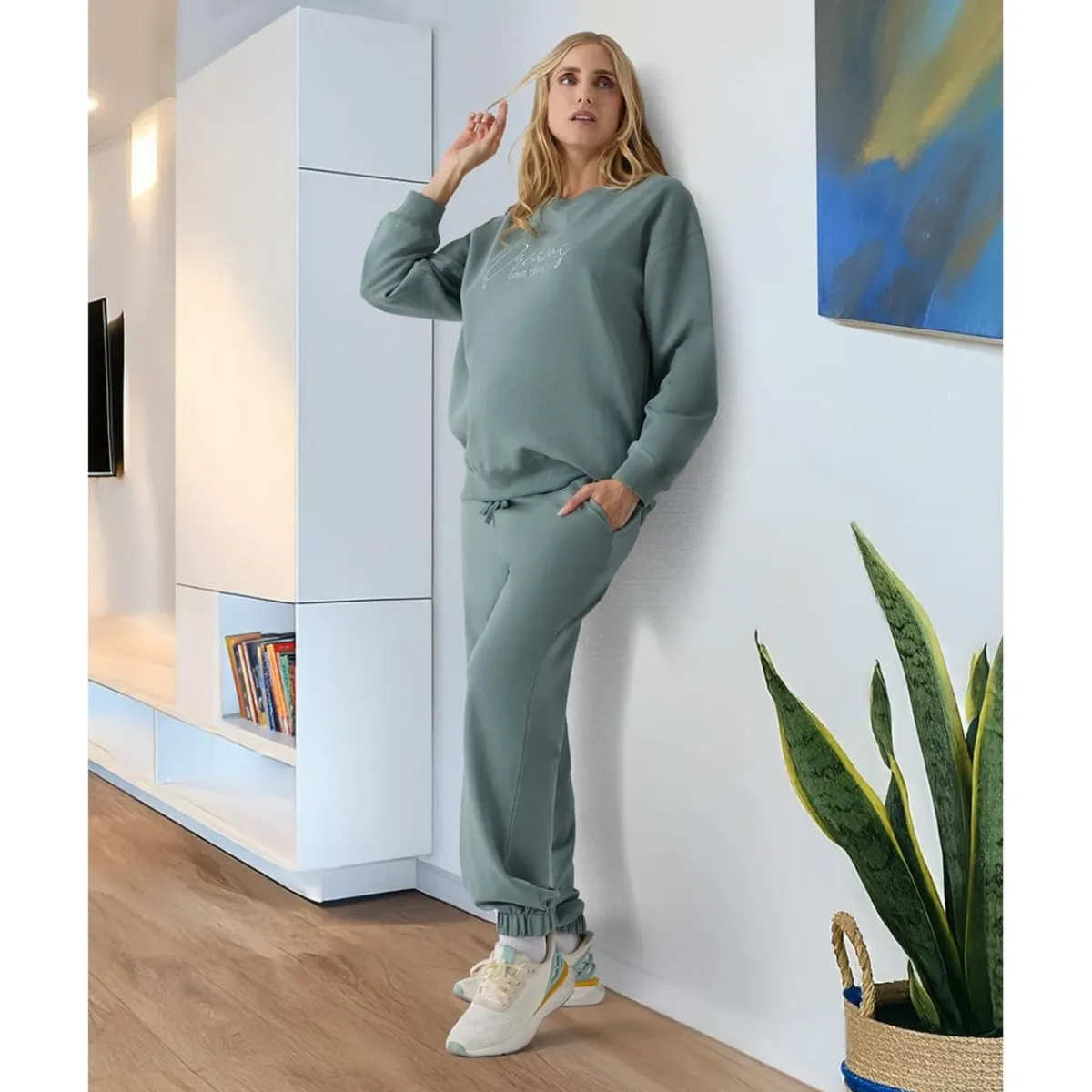 Esta felpa premamá en color verde combina comodidad y funcionalidad. Presenta bordado tono sobre tono en el pecho y cuello redondo. Su diseño amplio se adapta a la evolución de la tripa durante el embarazo. Incluye cremalleras laterales para facilitar la lactancia, convirtiéndose en una prenda práctica y versátil.