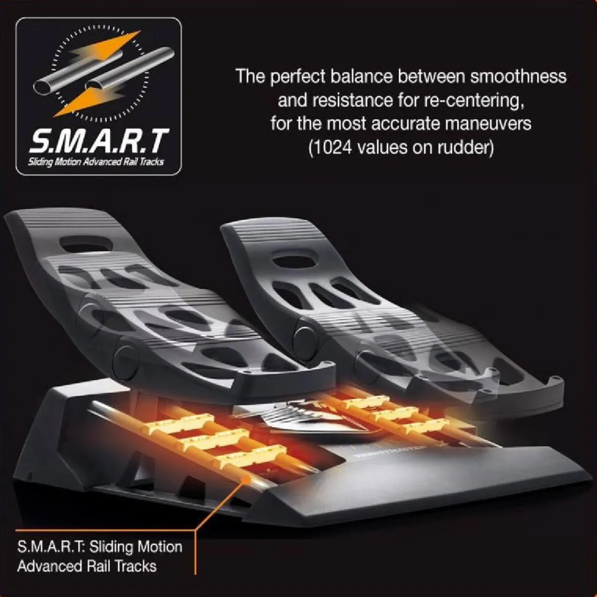 La longitud del recorrido, combinada con la fluidez de la tecnología S.M.A.R.T propiedad de Thrustmaster, permite a los pilotos activar el timón justo con la intensidad adecuada y con el movimiento deslizante sin sacudidas para lograr maniobras que son completamente precisas.