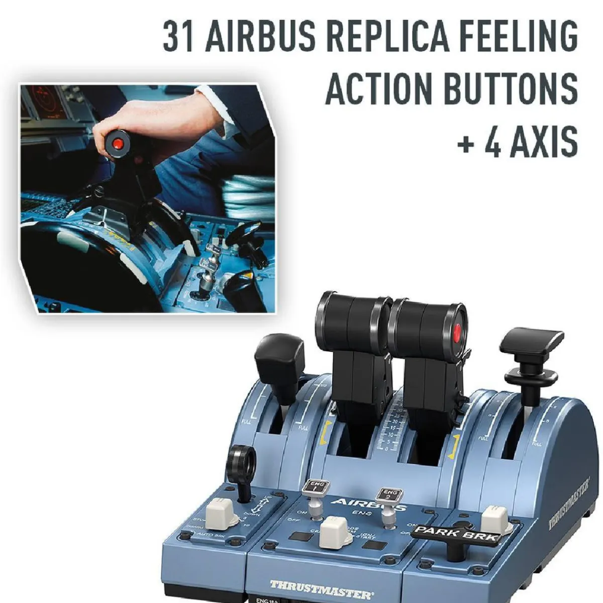 - 31 botones de acciones con sensaciones réplica de las de Airbus y 4 ejes en el cuadrante para una multitud de posibilidades en vuelo.