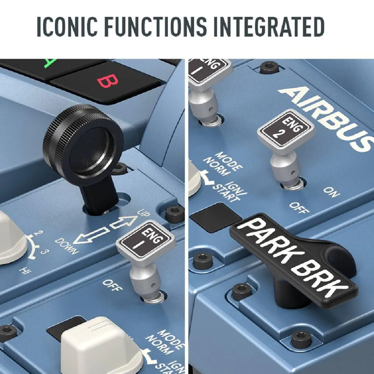 - Icónicos controles de cuadrante de Airbus que incluyen compensación, tren de aterrizaje, freno automático, compensador del timón y freno de estacionamiento, para una inmersión total.