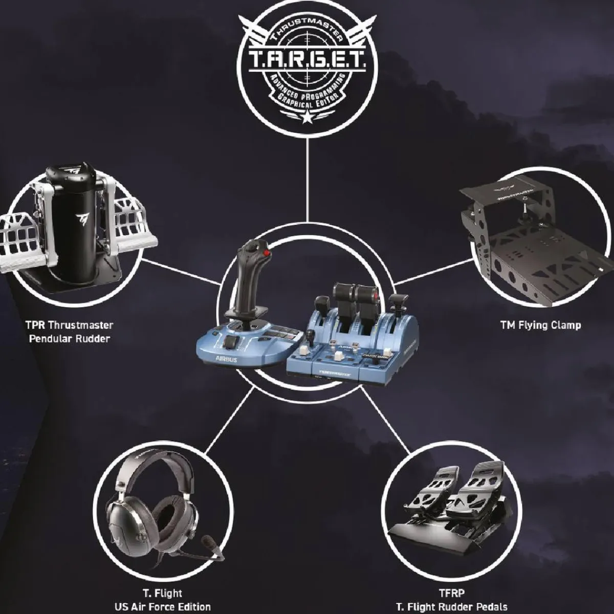 - Compatible con los sistemas de timón Thrustmaster T.Flight Rudder Pedals (TFRP) y Thrustmaster Pendular Rudder (TPR), así como con el TM Flying Clamp (todos vendidos por separado).