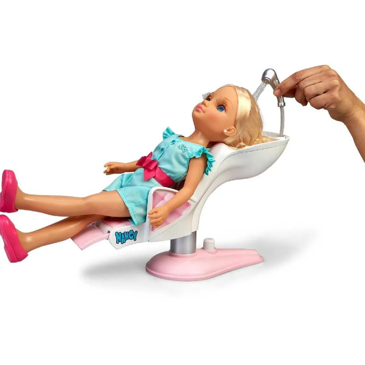 Llena el depósito con agua, sienta a la muñeca Nancy correctamente, presiona el botón de la bomba de agua y lava su pelo.