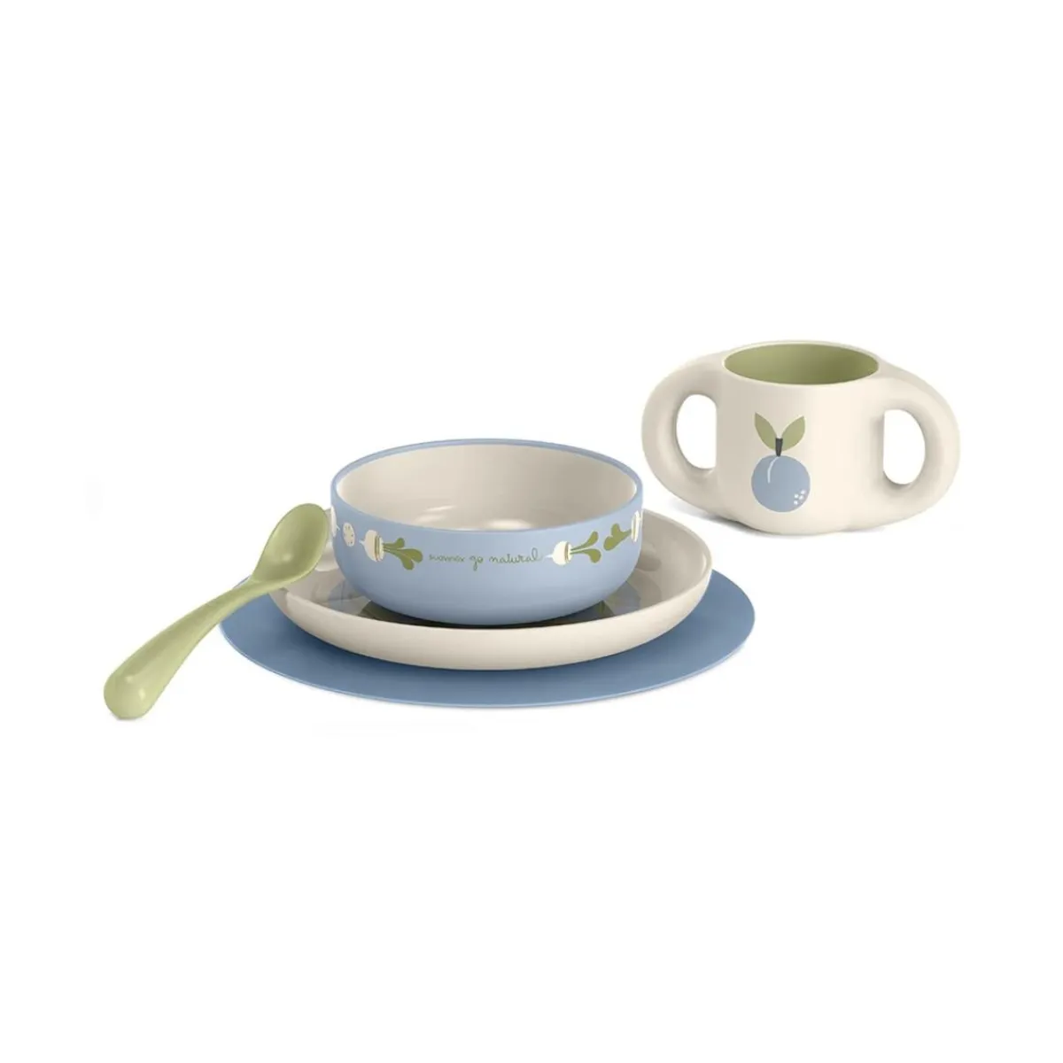El juego incluye un plato llano, un bol, una cuchara, una taza con asas y un práctico mantel individual antideslizante.